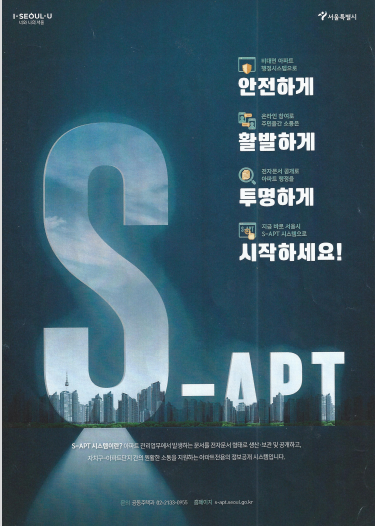 서울시는 ‘전자결재 기반 S-APT 플랫폼’이 '13년부터 아파트 관리비리 근절과 분쟁 예방을 위해 지속적으로 펼쳐온 ‘맑은 아파트 만들기’ 사업의 완결판으로 아파트 관리업무의 투명성 확보에 획기적인 전기가 될 것으로 기대한다고 밝혔다.