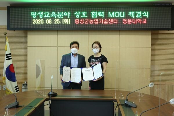 [무한뉴스] 홍성군 농업기술센터는 지난 25일 청운대학교 사회서비스대학과 함께 평생교육분야의 산학교류를 통한 상호 협력과 지역사회 발전 도모를 위해 업무협약을 체결했다.