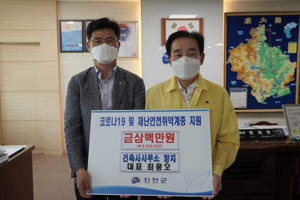 26일 군에 따르면, 진천읍 소재 양지 건축사사무소 최용오 대표가 코로나19 및 재난안전취약계층을 돕는데 써 달라며 성금 300만원을 기탁했고 이월면 소재 동아환경개발 박연기 대표도 성금 500만원을 기탁했다 또한, 25일 농업회사법인 ㈜진천에이치에스팜 이용일 회장도 성금 500만원을 기탁했다 군은 기탁된 성금을 대한적십자사충청북도지사에 지정 기탁 처리한 후 코로나19 지역확산방지 및 재난안전취약계층을 위해 활용 할 예정이다.
