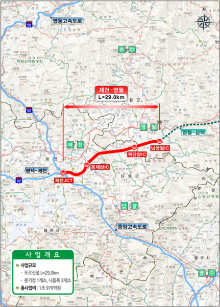 제천~영월고속도로는 2015년 6월 충주~제천 고속도로 준공 후 멈췄던 제천~삼척 구간 중 연장 29㎞를 총사업비 1조 천억원을 들여 4차로로 신설하는 사업으로 제천~삼척고속도로 건설의 마중물 역할을 할 것으로 기대되며 제천 동부지역 동제천IC와 단양 북부지역 북단양·구인사IC를 통해 직접 연결되어 이 지역 접근성이 대폭 개선될 것으로 보인다.