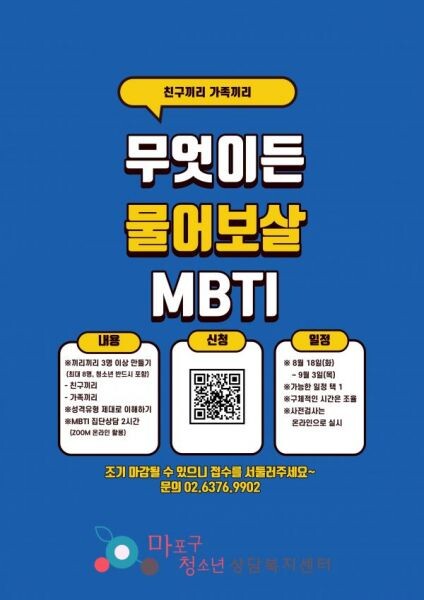[무한뉴스] 마포구는 오는 9월 3일까지 성격 유형에 대한 올바른 이해를 돕는 ‘무엇이든 물어보살 MBTI’ 집단상담 프로그램을 청소년상담복지센터에서 진행한다고 밝혔다.
