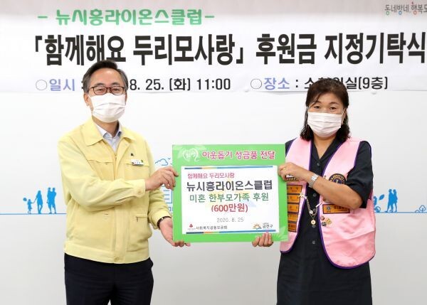 뉴시흥라이온스클럽은 이날 금천구 미혼 한부모가족들을 위해 1가구당 연60만원씩, 총 10가구에 600만원의 후원금을 지정 기탁했다.