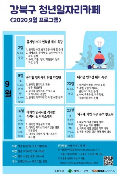[무한뉴스] 강북구가 신종 코로나바이러스 감염증 확산에 따른 취업 준비생의 어려움을 해소하기 위해 9월 청년일자리카페 취업지원 프로그램을 비대면 운영한다.