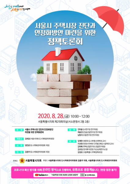 서울시의회 도시계획관리위원회는 도시계획관리위원회 김종무 위원과 공동으로 8월 28일 오전 10시 서울특별시의회 제2대회의실에서‘서울시 주택시장 진단과 안정화 방안 마련을 위한 토론회’를 개최한다.