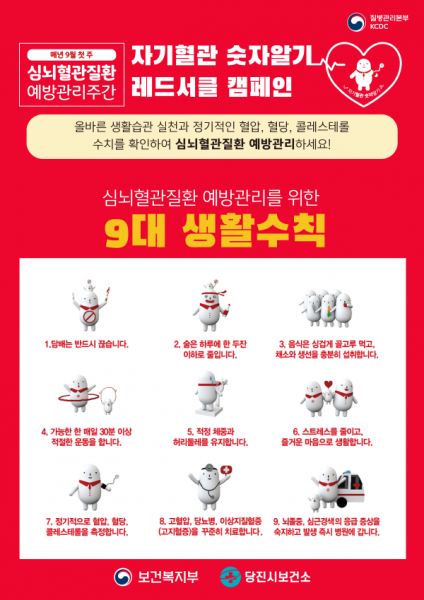 ‘자기혈관 숫자알기, 레드서클 캠페인’은 자신의 혈압, 혈당, 콜레스테롤의 수치를 알고 관리해 심뇌혈관질환을 예방하자는 취지의 전국단위 합동캠페인으로 매년 9월 실시하고 있다.
