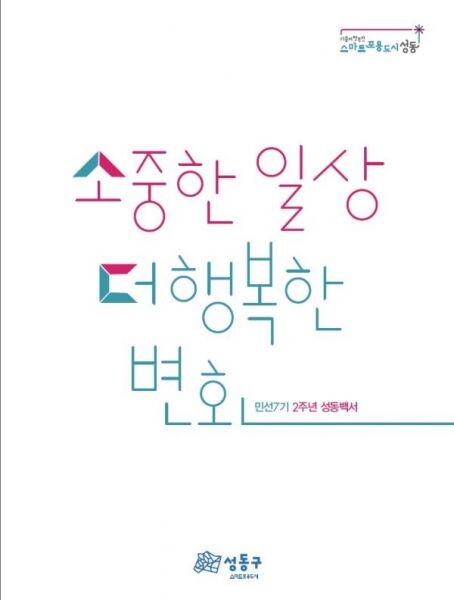 이번 백서는 ‘소중한 일상, 더 행복한 변화’라는 부제 아래 성동구의 비전, 그간의 수상실적, 주민이 뽑은 10대뉴스와 민선 7기 역점사업 7개 분야, 108개 사업의 소개로 구성했다.