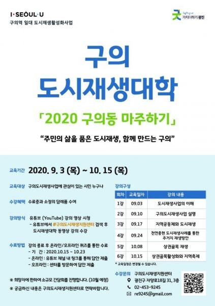 강의는 구의도시재생지원센터 유튜브를 통해 10월 15일까지 매주 목요일 도시재생사업의 이해 지역공동체와 도시재생 등 새로운 주제로 업로드되며 관심있는 주민은 누구나 수강할 수 있다.