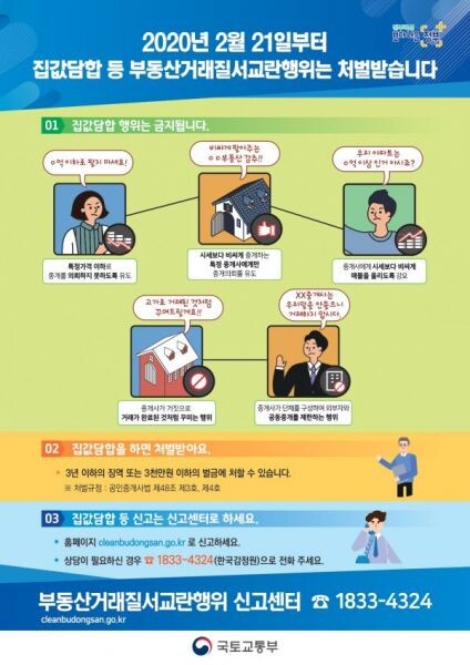 또한 상반기에 시행 사항에 따라 “이익을 위해 시세에 부당한 영향을 주거나 시세를 높게 중개하는 공인중개사 등에게만 중개의뢰 유도하는 행위, 특정 가격 이하로 중개를 의뢰하지 아니하도록 유도하는 행위 등 부동산 교란행위 및 시세담합 행위”는 3년 이하의 징역 또는 3천만원 이하의 벌금에 처해진다.