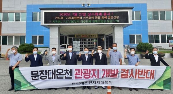 문장대온천개발저지 괴산군대책위원회는 괴산군청과 충북도청에서 문장대온천 개발에 반대하는 성명을 발표한 뒤 대구지방환경청과 상주시를 항의 방문했고 괴산군의회 역시 문장대온천 개발 저지를 위한 성명을 채택하는 등 온천 개발을 막기 위해 발 빠르게 움직이고 있다.