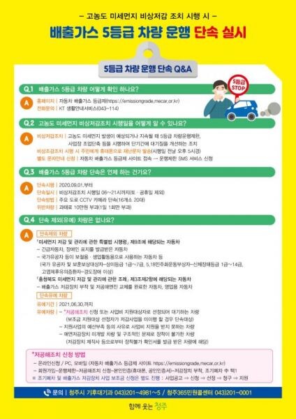 [무한뉴스] 청주시가 미세먼지 저감대책의 일환으로 오는 9월 1일부터 고농도 미세먼지 비상저감조치 시행일에 지역 내에서 운행되는 전국 배출가스 5등급 차량에 대해 단속을 실시한다.