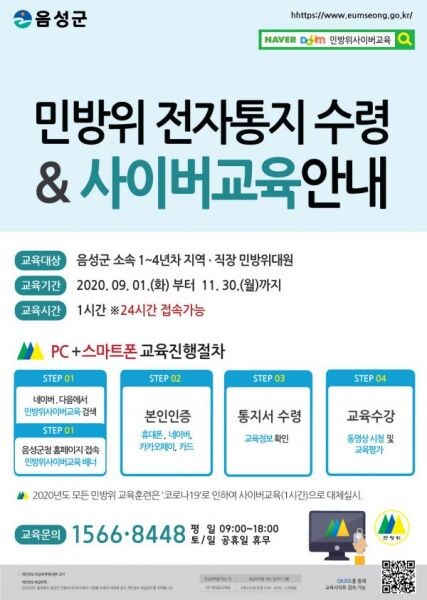 [무한뉴스] 충북 음성군은 지난 7월부터 시행중인 민방위 5년차 이상 대원 사이버교육에 이어 1~4년차 대원들에 대한 민방위 사이버교육을 9월부터 시행한다고 1일 밝혔다.