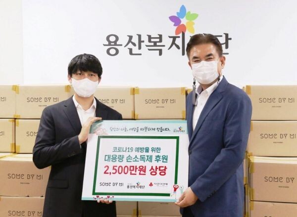 [무한뉴스] ㈜페렌벨의 자연주의 스킨케어 브랜드 썸바이미가 28일 용산복지재단에 대용량 손소독제 1920개를 기부했다.