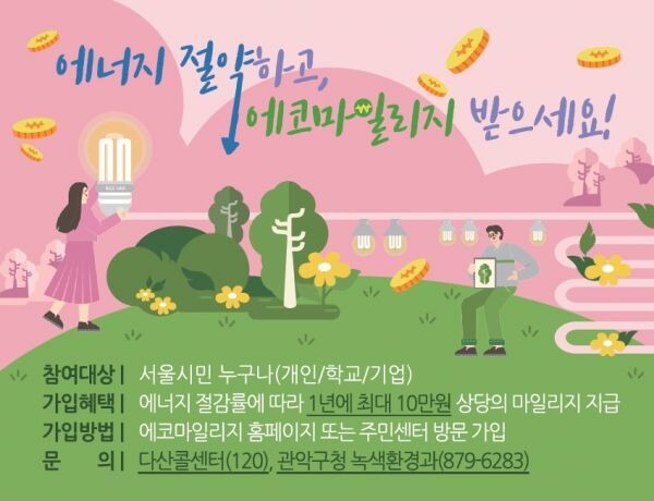 [무한뉴스] 관악구는 가정의 에너지 사용량을 절약하면서 적립된 마일리지로 다양한 혜택을 누릴 수 있는 에코마일리지 신규 회원을 모집한다.