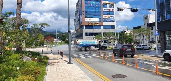 [무한뉴스] 예산군은 폭염으로 인해 어려움을 겪는 군민들에게 쾌적한 도로환경을 제공하고자 시가지 주요도로에 대해 살수작업을 실시 중이라고 밝혔다.