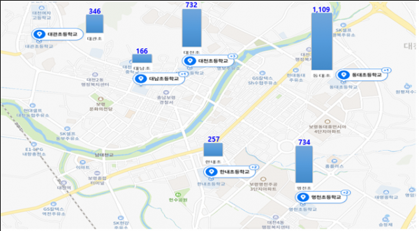 구체적으로 2017년 총 학생인구 3534명 중 절반이 넘는 1900명이 대천·동대초 2곳에 집중돼 있었고 2020년에는 3344명 중 1841명이 두 학교에 다니는 것으로 집계됐다.