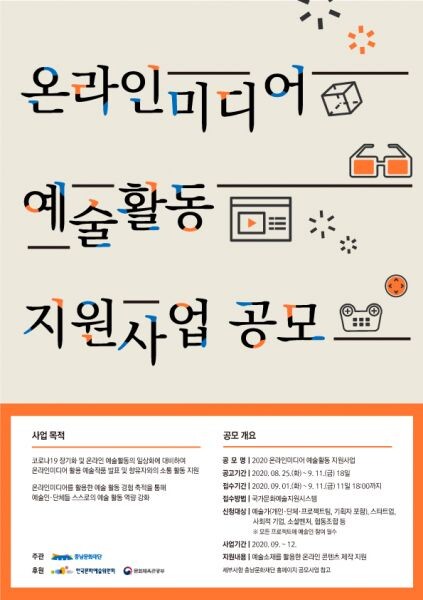 이번 사업은 미디어를 활용해 예술 작품을 발표하거나 온라인을 통해 문화향유자들과의 소통 활동에 대한 지원, 예술가들의 수익활동이 가능한 플랫폼 구축 등을 지원한다.
