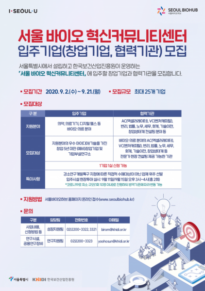 신청·접수 관련 문의는 서울바이오허브 성장지원팀 , 연구시설·공용연구장비 문의는 연구지원팀으로 전화하면 된다.
