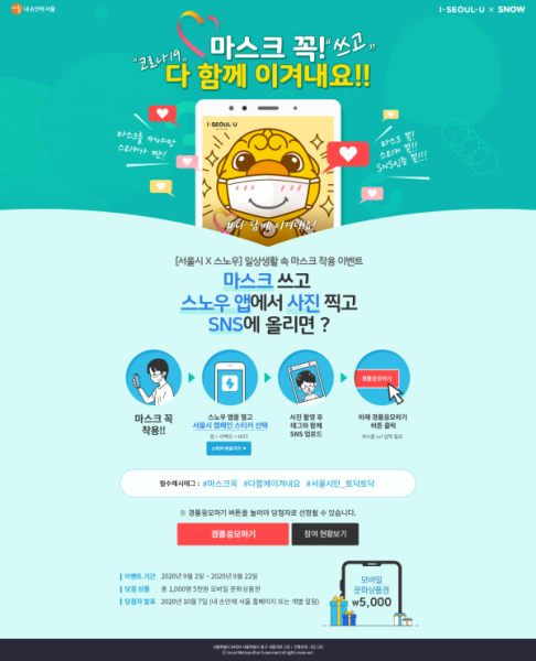 캠페인 참여방법은 스노우 앱에서 이팩트 ’ HOT 탭에 위치한 캠페인 스티커를 선택해 사진을 촬영한 후, 해시태그 ‘#마스크꼭’, ‘#다함께이겨내요’, ‘#서울시민_토닥토닥’과 함께 개인 SNS에 마스크 착용샷을 올리면 된다.