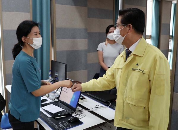 서산시 선별진료소에서 양 지사는 서산 지역 코로나19 확진자 관련 진단 검사 현황을 듣고 관계자들을 격려했다.