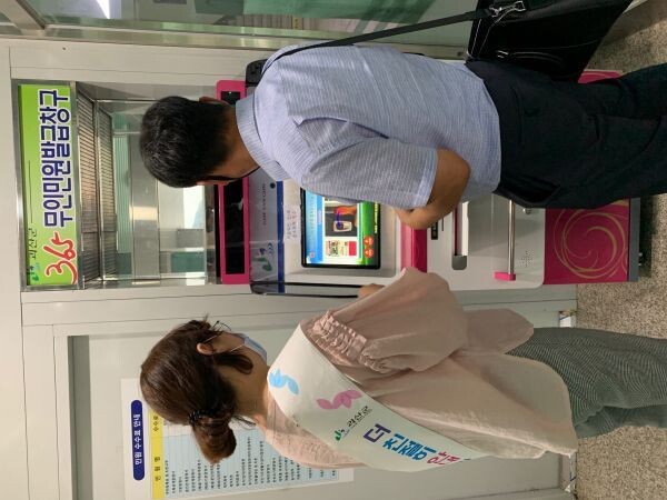 친절안내도우미는 ‘더 친절히 안내한다’라는 문구가 적힌 어깨띠를 두르고 주민자치센터를 방문하는 주민들의 방문목적 확인 업무 담당자 안내 무인민원발급기 사용법 안내를 돕고 있다.