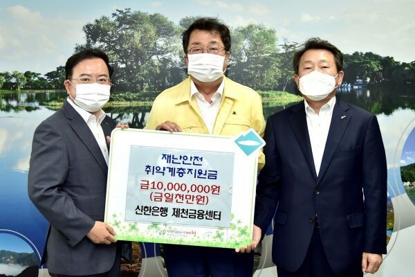 이상천 제천시장은 “항상 어려울 때마다 지역주민들을 위한 지원에 힘써주시는 신한은행 제천금융센터에 감사드린다”며 “피해 주민들에게 따뜻한 마음이 전달되어 분명 큰 힘이 될 것이다”고 전했다.