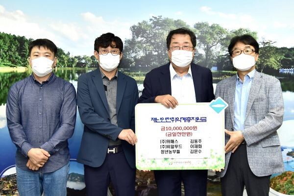 [무한뉴스] 지역정착지원형 청년일자리사업 참여기업 중 ㈜위매스, ㈜비알푸드, 청년농부들 등 3개 기업에서 지난 8월 초 집중호우로 피해를 입은 제천지역 수해피해 주민들을 위한 재난안전 취약계층 지원금 1천만원을 지난 2일 제천시에 기탁했다.