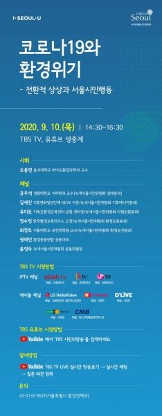 유튜브 ‘TBS 시민의방송’ 검색 → TBS TV LIVE 실시간 방송보기 → 실시간 채팅에 댓글 입력 정수용 서울시 기후환경본부장은 “코로나19와 태풍, 긴 장마 등 환경위기로 인해 유례없이 어려운 시기를 지나고 있다”며 “코로나19와 기후위기를 극복하기 위해 이번 토론회에 시민 여러분의 많은 관심과 참여를 바란다”고 말했다.