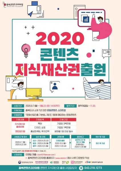 충청북도와 청주시가 주관하고 청주시문화산업진흥재단, 충북과학기술혁신원이 운영하는 ‘충북콘텐츠코리아랩’이 오는 22일까지, ‘2020 콘텐츠 지식재산권 출원’ 공모를 진행한다고 밝혔다.