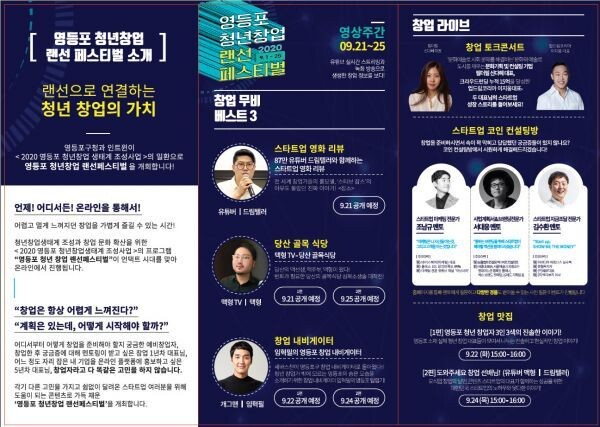 [무한뉴스] 영등포구(구청장 채현일)가 청년의 창업역량 강화를 돕고 지역 내 창업 문화 확산을 위한 ‘영등포 청년창업 랜선 페스티벌’을 9월 25일까지 개최한다.