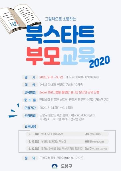 이동진 도봉구청장은 “사회적 거리두기로 지친 부모가 영유아와 함께 교육을 들으며 자녀의 건강한 성장을 돕고 그림책을 통해 부모와 자녀 간 올바른 관계형성 및 소통 할 수 있는 유익한 시간이 되길 바란다”고 전했다.