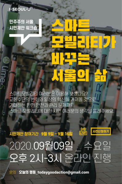[무한뉴스] 서울시는 오는 9일 오후 2시 ‘스마트 모빌리티가 바꾸는 서울의 삶’에 대한 시민의 다양한 제안을 발굴하기 위해 ‘온라인 시민제안 워크숍’을 개최한다.