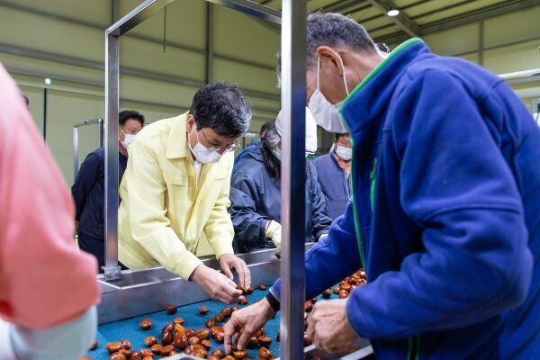 7일 장평면 소재 정산농협 농산물산지유통센터 밤 수매현장을 찾아 생산 농가를 격려한 김돈곤 군수는 “폭염과 연이은 태풍 등 어려운 상황을 이겨내고 고품질 청양 밤을 생산한 농민들의 노고에 감사드린다”며 “산림 분포가 많은 지역특성을 최대한 활용하기 위해 임산물 생산과 유통에 더 많이 투자하겠다”고 밝혔다.