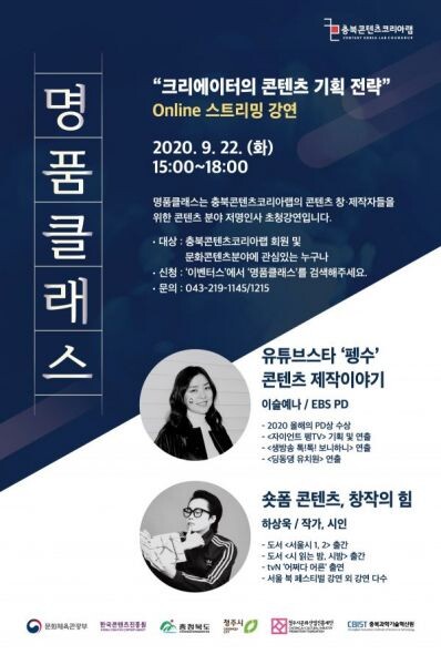 사전신청자에 한해 온라인 생중계로 진행하는 이번 명품클래스는 강연 당일 오후 1시까지만 충북콘텐츠코리아랩 홈페이지와 이벤터스 사이트에서 접수받는다.