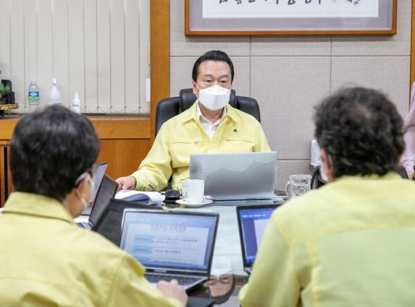 회의에선 김진선 행정관리국장으로부터 ‘코로나19 사회적 거리두기 단계별 대응을 위한 재택근무 시범 실시’, 이덕수 건설교통국장으로부터 ‘태풍 등 재해 발생 사전 대비’ 보고가 있었다.