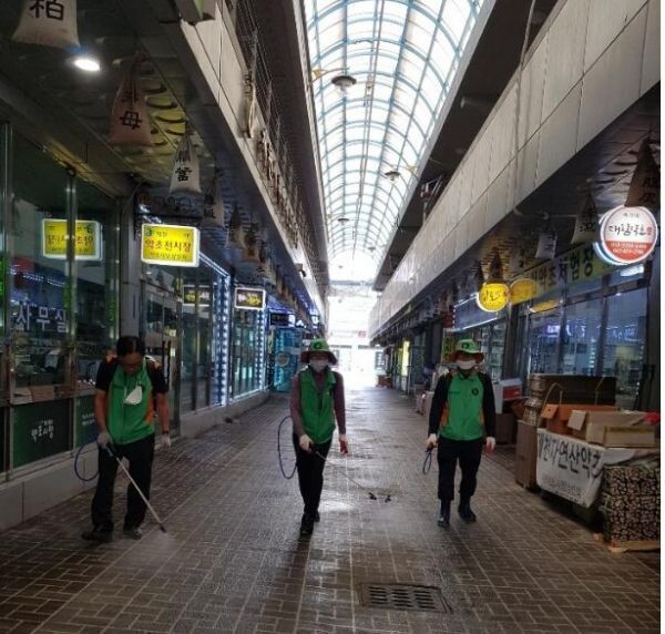 [무한뉴스] 제천시 지역자율방재단 20여명의 단원들은 지난 8일 전통시장과 고추시장, 공중화장실, 시내버스 승강장 등에 생활방역을 실시했다.