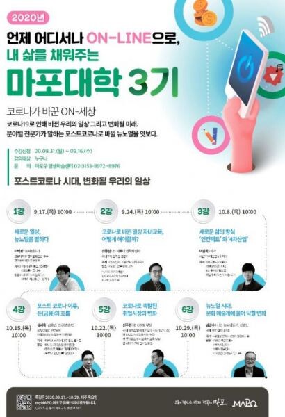 3기 과정은 ‘포스트코로나 시대, 변화될 일상’이라는 주제로 분야별 전문가들의 지식을 나누고 사유와 성찰의 시간을 갖도록 기획됐으며 9월 17일부터 10월 29일까지 매주 목요일 10시에 마포구 유튜브에 업로드 될 예정이다.