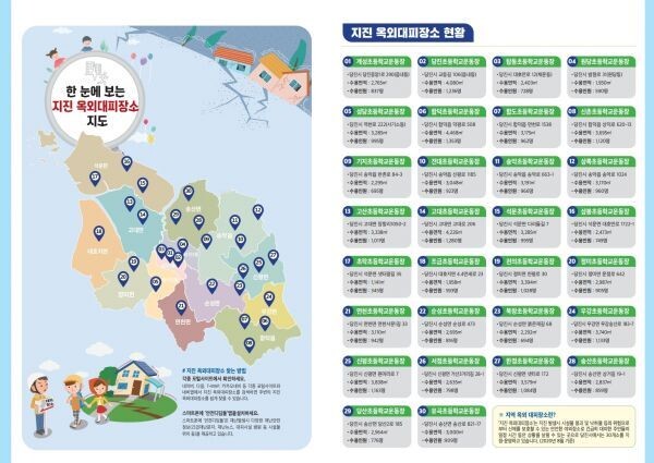 [무한뉴스] 당진시는 지진안전주간을 맞아 지진안전 온라인 캠페인 추진과 주민들의 신속하고 안전한 대피를 위해 지진행동요령 홍보물과 ‘지진 옥외대피소 안내지도’를 제작 및 배부한다고 밝혔다.