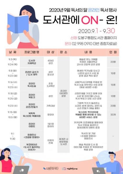 [무한뉴스] 도봉구 쌍문채움도서관은 오는 9월 독서의 달을 맞아 코로나19 확산 예방에 대응하는 온라인 독서의 달 행사 ‘도서관의 ON’을 운영한다.