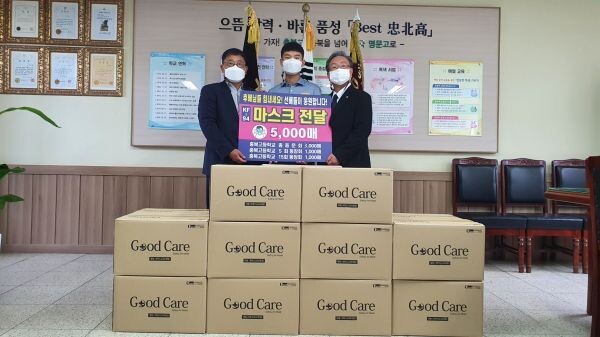 김헌수 충북고등학교 총동문회장이 충북고를 방문해 KF94 마스크 3,000장, 5회와 15회 동문회에서 마련한 KF94마스크 각 1,000장씩 마스크 총 5,000장을 충북고등학교 후배들을 위해 기증했다.
