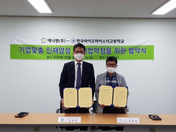 [무한뉴스] 한국바이오마이스터고등학교는 9월 9일 오후 2시 애니젠 오송공장에서 애니젠와 인재 육성 및 취업약정을 위한 산학협력 협약을 체결하고 바이오제약과 학생 3명을 품질관리 및 제조, 개발 분야에 채용을 약정했다.