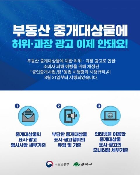 박겸수 강북구청장은 “중개대상물의 허위광고로 인한 피해는 고스란히 집을 구하는 주민들에게 돌아온다”며 “부동산 시장의 공정한 거래질서를 확립하고 구민의 재산권을 보호하기 위해 불법 행위에 단호히 대처하겠다”고 말했다.