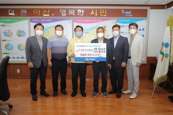 [무한뉴스] 대한건설협회 세종·충남도회 아산시협의회가 주택침수 등으로 어려움을 겪고 있는 주민을 위해 지난 10일 아산시에 500만원 상당의 생필품 세트를 기부했다.