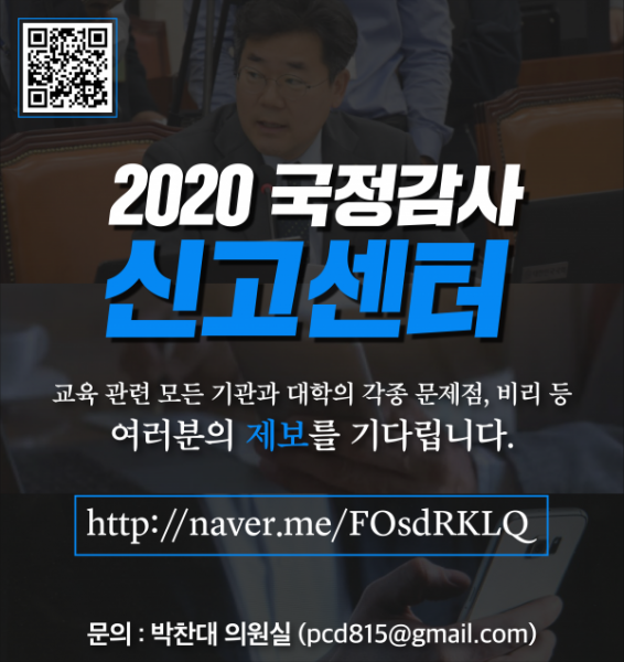 박찬대 의원은 “코로나19로 모두가 어려운 상황임에도 국회는 국민들의 혈세가 보다 올바르게 쓰이도록 감시할 의무가 있다”며“국회 교육위원회의 간사로서 세금 운용과 대한민국의 교육이 올바른 방향으로 나아가는데 국민들의 힘을 모으고자 이번 국정감사 신고센터를 마련했다”고 밝혔다.