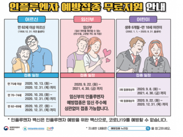 올해는 코로나19 유행으로 무료접종대상을 기존 생후 6개월부터 12세 어린이까지에서 생후 6개월부터 만18세 청소년까지로 만65세 이상 노인에서 만62세 이상 노인으로 확대했다.