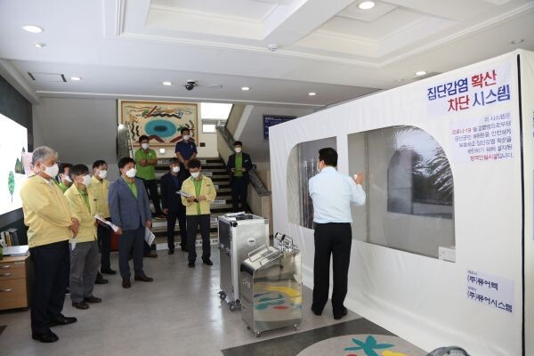 [무한뉴스] 금산군은 지난 14일 청사 현관 입구에 집단감염 차단 시스템으로 공간멸균기와 클린존을 설치하고 운영에 들어갔다.