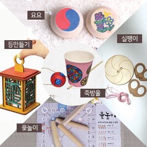 전통놀이 5종은 실팽이 꾸미기, 요요 꾸미기, 윷 꾸미기, 전통문양등 만들기, 죽방울 만들기로 구성되어 있으며 놀이꾸러미 안에는 활동재료뿐만 아니라 활동 놀이명과 놀이방법이 적힌 설명서도 함께 들어 있어 가정에서 아이와 함께 손쉽게 민속문화체험 놀이를 즐길 수 있다.