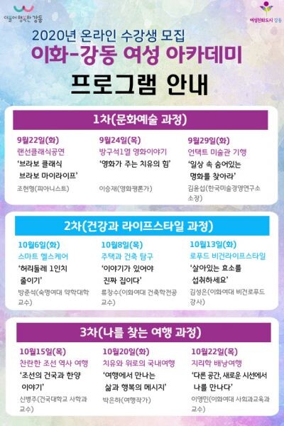 구 관계자는 “이번 이화-강동 여성아카데미는 코로나 시대에 배움과 소통의 기회를 제공하기 위해 온라인으로 마련했다”며 “코로나로 지친 몸과 마음을 치유할 수 있는 계기가 되길 바란다”고 전했다.