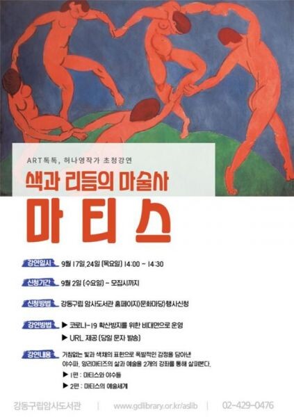 [무한뉴스] 강동구 암사도서관이 이달 17일과 24일 2회에 걸쳐 ‘색과 리듬의 마술사 마티스’를 주제로 온라인 미술특화 프로그램을 마련한다.
