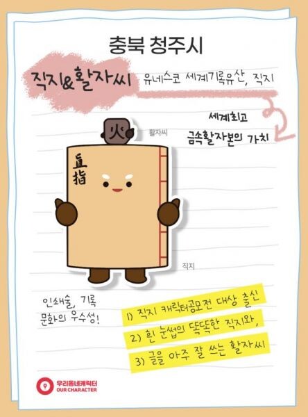 [무한뉴스] 청주시의 직지 캐릭터 ‘직지와 활자씨’가 지난 1일부터 진행된 문화체육관광부와 한국콘텐츠진흥원이 주최하는 ‘제3회 우리동네 캐릭터 대상 공모전 - 지역 부문’에 참가해 본선에 진출하는 쾌거를 이뤘다.