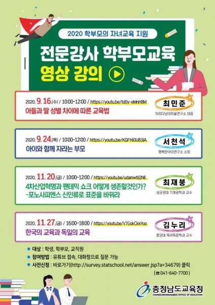 [무한뉴스] 충남교육청은 학부모의 자녀교육 역량강화를 위해 전문강사를 초청해 학부모 연수를 4회에 걸쳐 실시한다고 밝혔다.